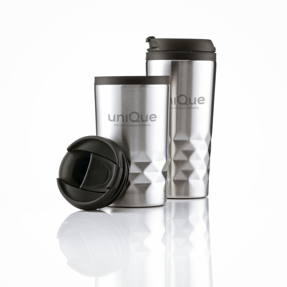 Dubbelwandige RVS thermosbeker met schroefdeksel en klikopening. PP binnenwand. Met opvallend 3D-geometrisch diamantpatroon in de houder. Slipvaste onderzijde. Niet vaatwasserbestendig. Inhoud 300 ml. Per stuk verpakt.