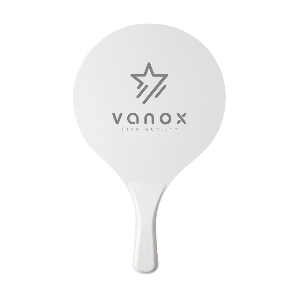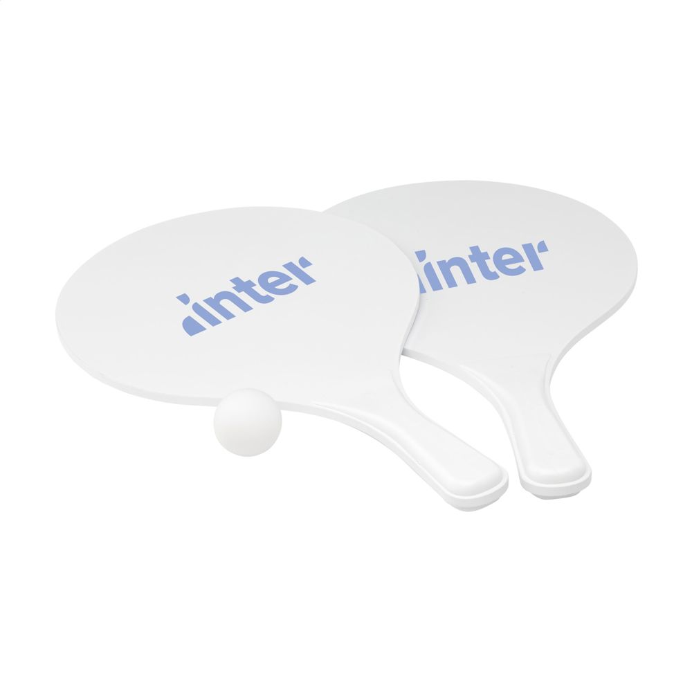 Sportieve strandset: 2 rackets van MDF hout met PP kunststof handgrepen en rubber balletje. Per set in een mesh opbergnet. NOTE: Bij opdruk in 2 kleuren op de rackets is geen perfect pas-/sluitwerk mogelijk - alleen mogelijk als de kleuren elkaar niet raken.