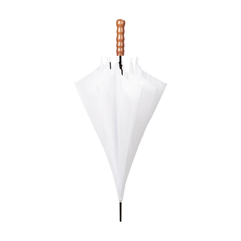 Paraplu met automatische telescoopvering, 190T polyester bespanning, metalen frame en steel, houten handgreep en klittenbandsluiting.