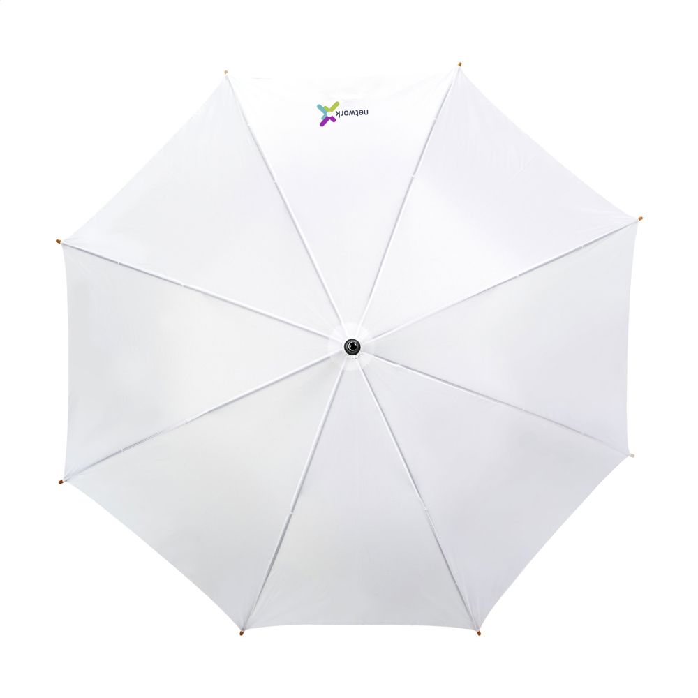 Paraplu met automatische telescoopvering, 190T RPET pongee bespanning, metalen frame, houten steel en handgreep en klittenbandsluiting. RCS-gecertificeerd. Totaal gerecycled materiaal: 15%.