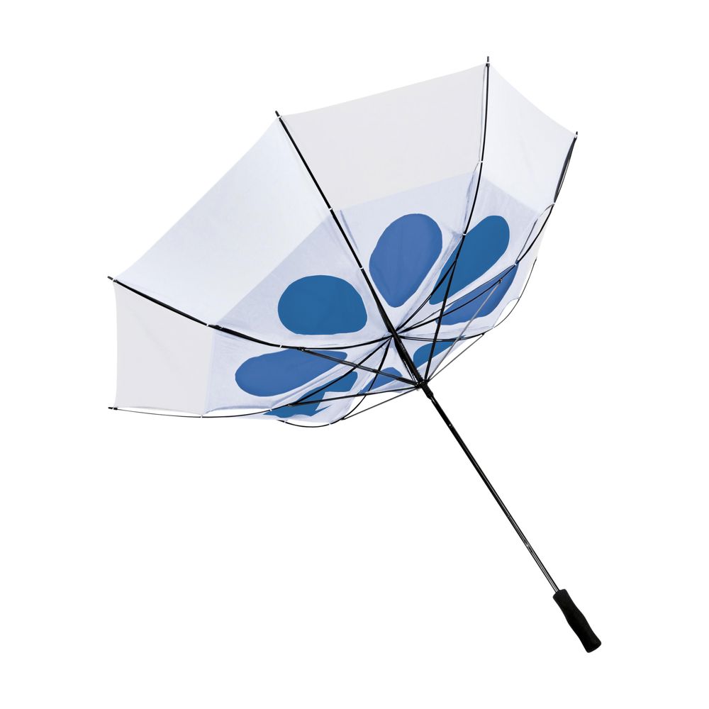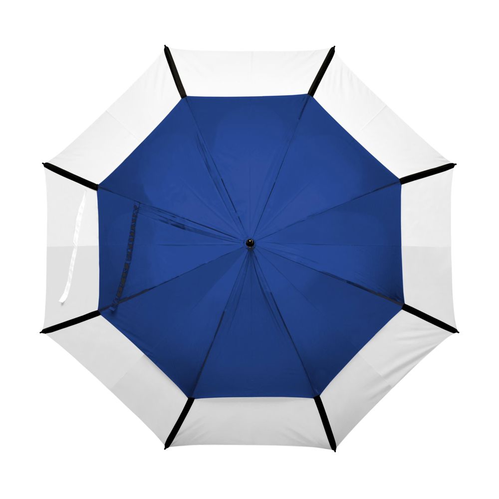 Luxe dubbellaags golfparaplu met 190T polyester en 190T nylon bespanning, stormfunctie, windbreker systeem, glasvezel frame en steel, voorgevormde foam handgreep en dubbele klittenbandbandsluiting. In opberghoes.