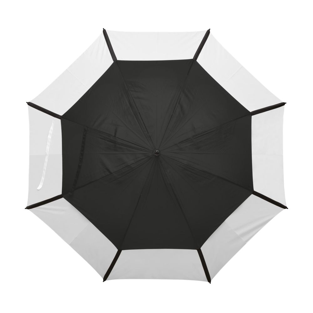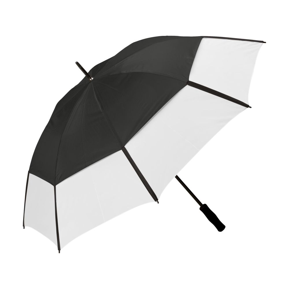 Luxe dubbellaags golfparaplu met 190T polyester en 190T nylon bespanning, stormfunctie, windbreker systeem, glasvezel frame en steel, voorgevormde foam handgreep en dubbele klittenbandbandsluiting. In opberghoes.