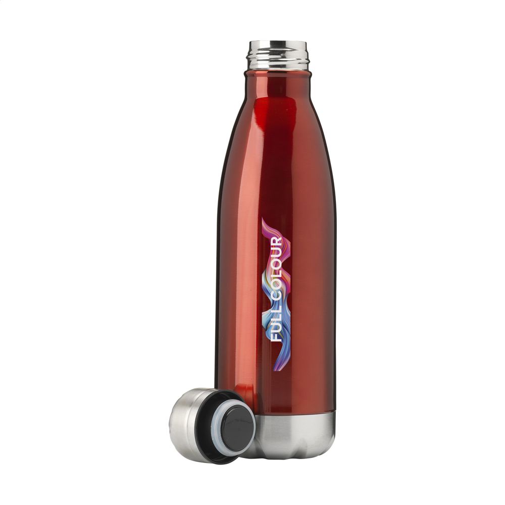 Dubbelwandige, vacuüm geïsoleerde, RVS waterfles/thermosfles. Met lekvrije schroefdop. Uitgevoerd in metallic of met mooie toplaag in matte finish (alleen de zwarte en de witte). Geschikt voor het op temperatuur houden van koud of warm water. Niet vaatwasserbestendig. Inhoud 500 ml. Per stuk verpakt.