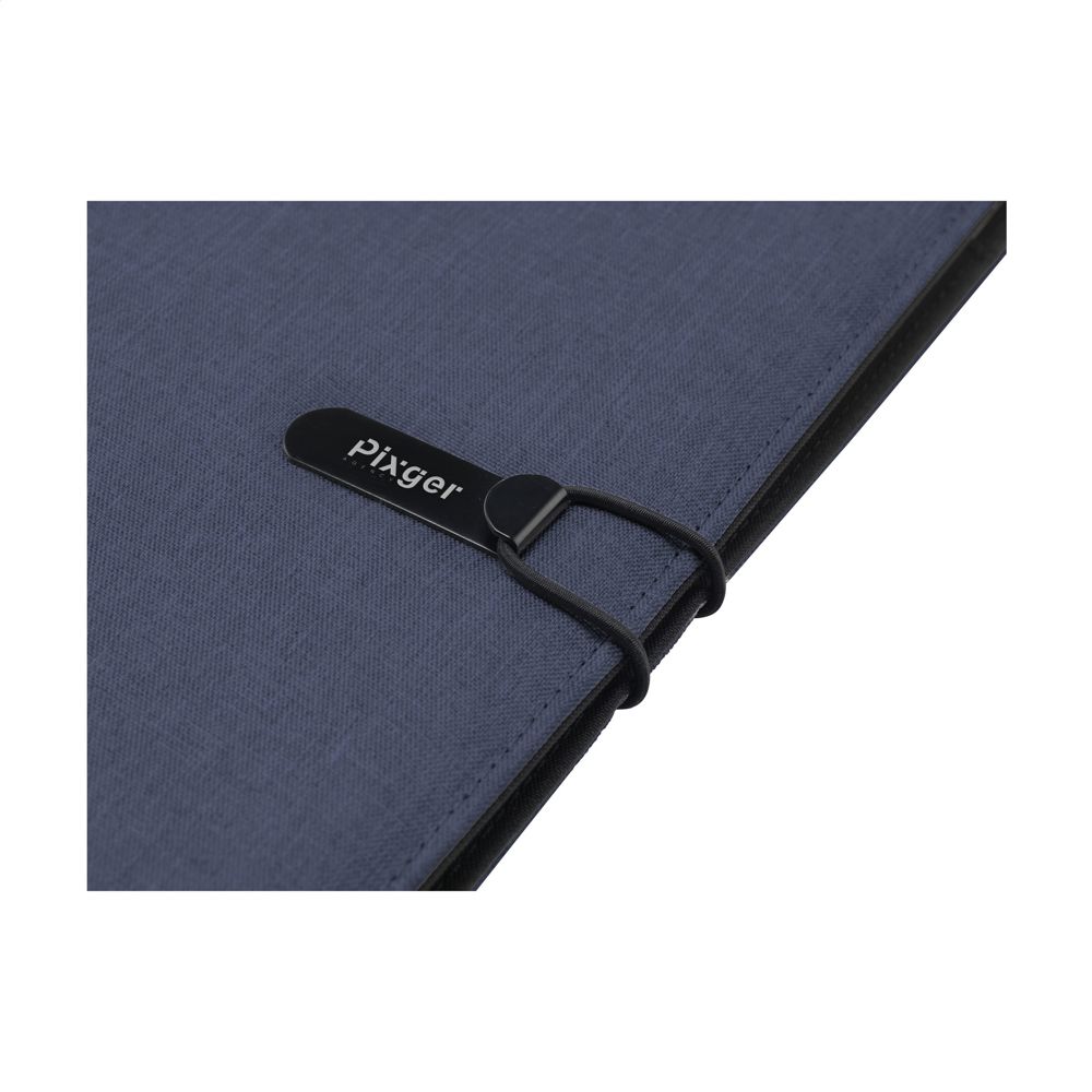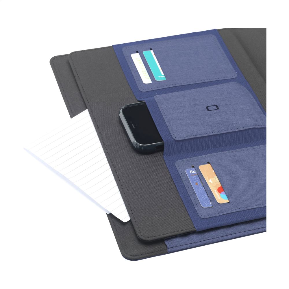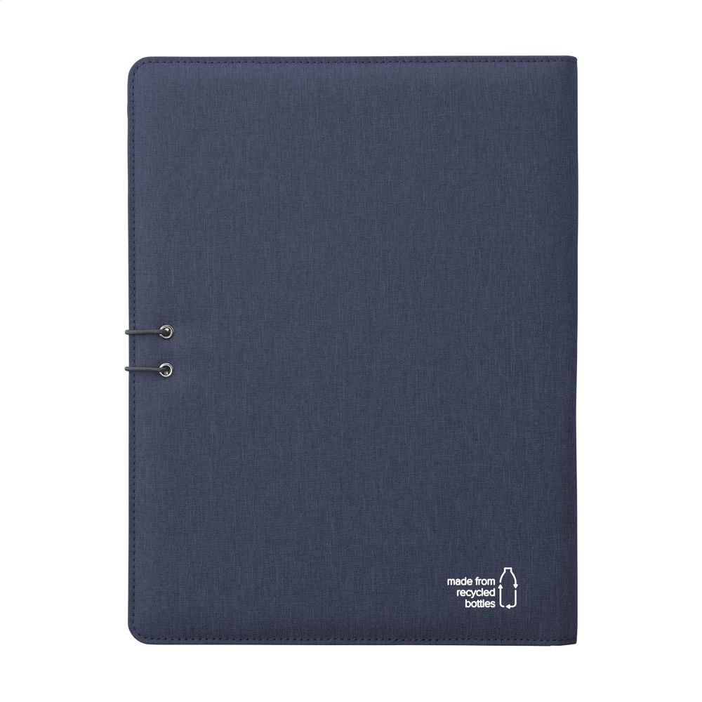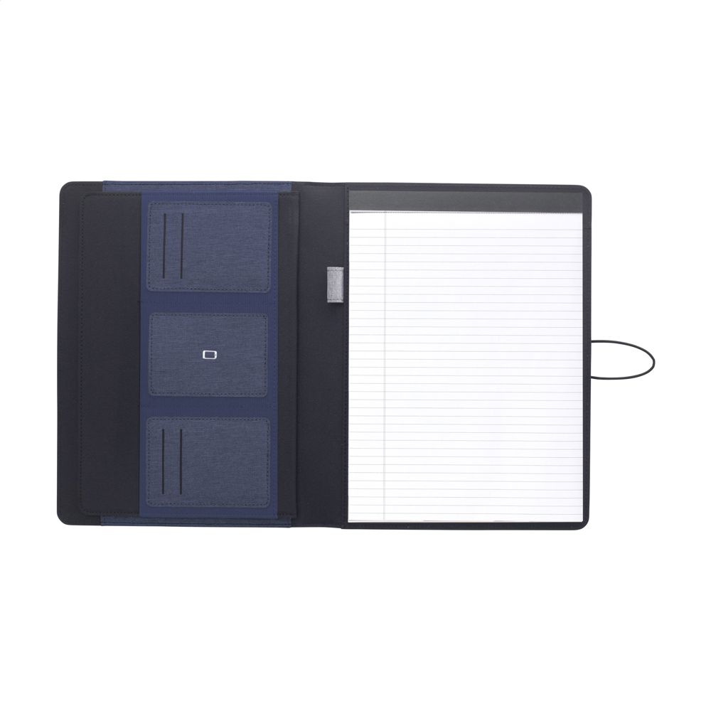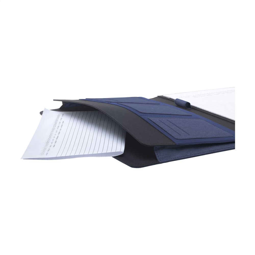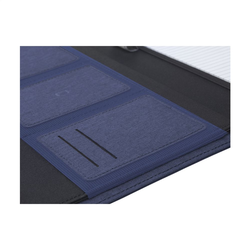 Moderne schrijfmap/documentenmap gemaakt van RPET-materiaal. In A4-formaat. Voorzien van diverse insteekvakken, waaronder een apart vak voor het opbergen van een mobiele telefoon, en een pennenlus. Incl. schrijfblok met 20 vel FSC gecertificeerd, wit gelinieerd papier (70 g/m²). RCS-gecertificeerd. Totaal gerecycled materiaal: 6%.