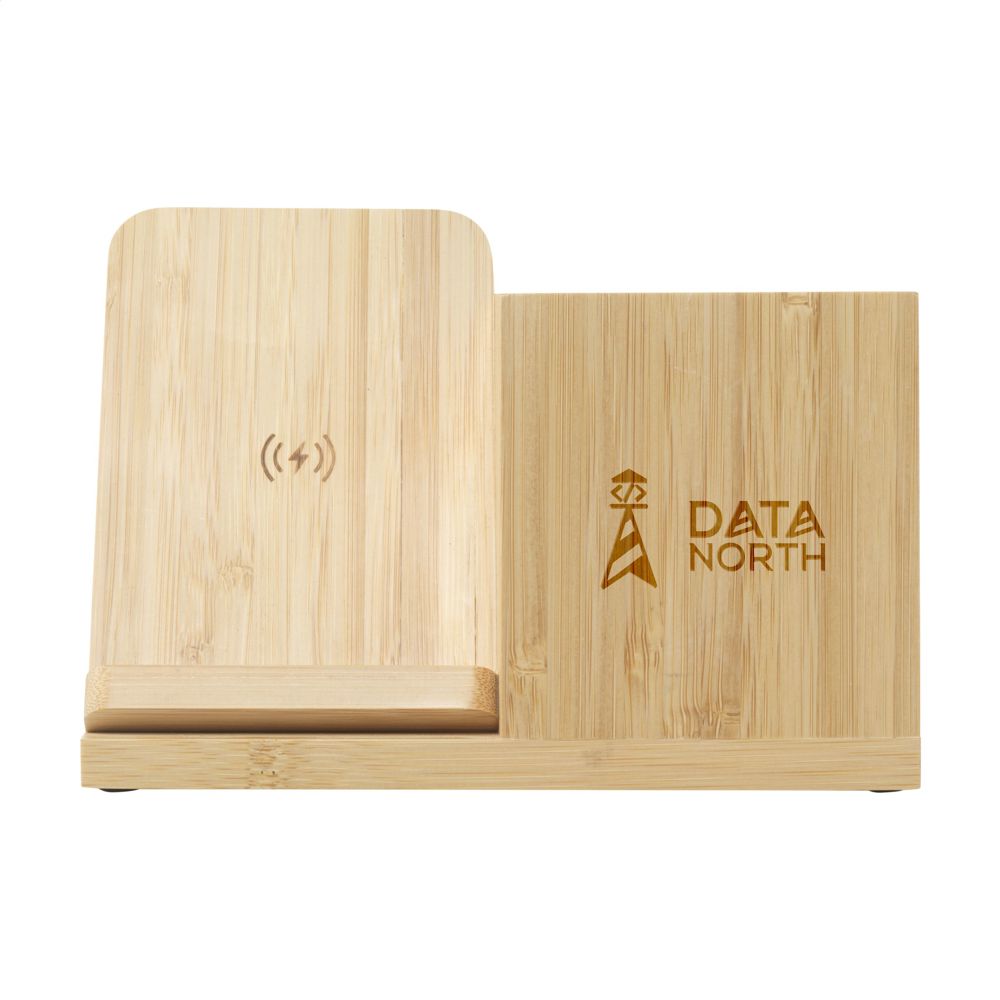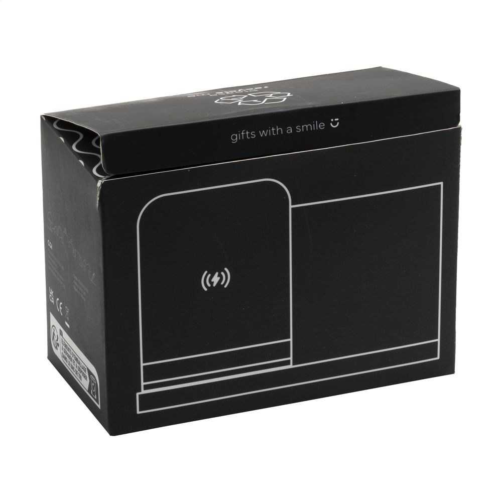 Draadloze 15W oplaadstandaard en pennenhouder in één. Dit bureauaccessoire is van hoogwaardig FSC 100% gecertificeerd bamboe. De 15W oplader is ideaal voor het opladen van mobiele telefoons. Compatibel met alle mobiele apparaten die QI draadloos laden ondersteunen (nieuwste generaties Android en iPhone). Input: 9V/2A. Draadloze output: 15W. In de handige houder bewaar je pennen en kleine voorwerpen. Zo houd je je bureau overzichtelijk en georganiseerd. Inclusief PVC-vrije oplaadkabel USB-C naar USB-C en gebruiksaanwijzing. Per stuk verpakt.