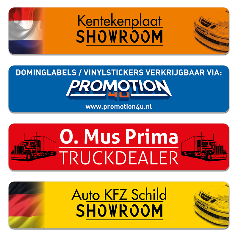 Verkopers van auto's maken vaak gebruik van deze kentekenplaten. Ze bevatten vaak naast het kenteken, het logo van het bedrijf en contactmogelijkheden. Deze kentekenplaten worden gemaakt van 1 mm Polystyreen en eenzijdig bedrukt met hoogwaardige UV-inkten in hoge resolutie. Daardoor zijn deze platen in hoge mate krasvast, kunnen ze zonder probleem buiten en binnen gebruikt worden en beschadigen ze nauwelijks. Dit product is een professionele en duurzame oplossing om informatie te verstrekken.