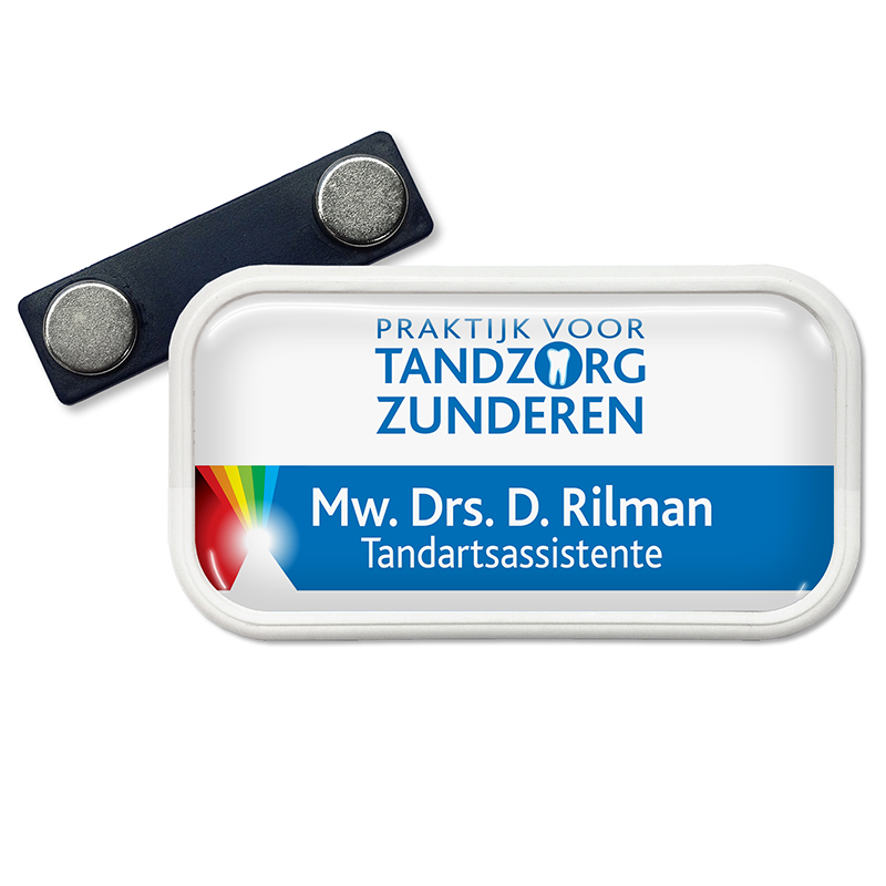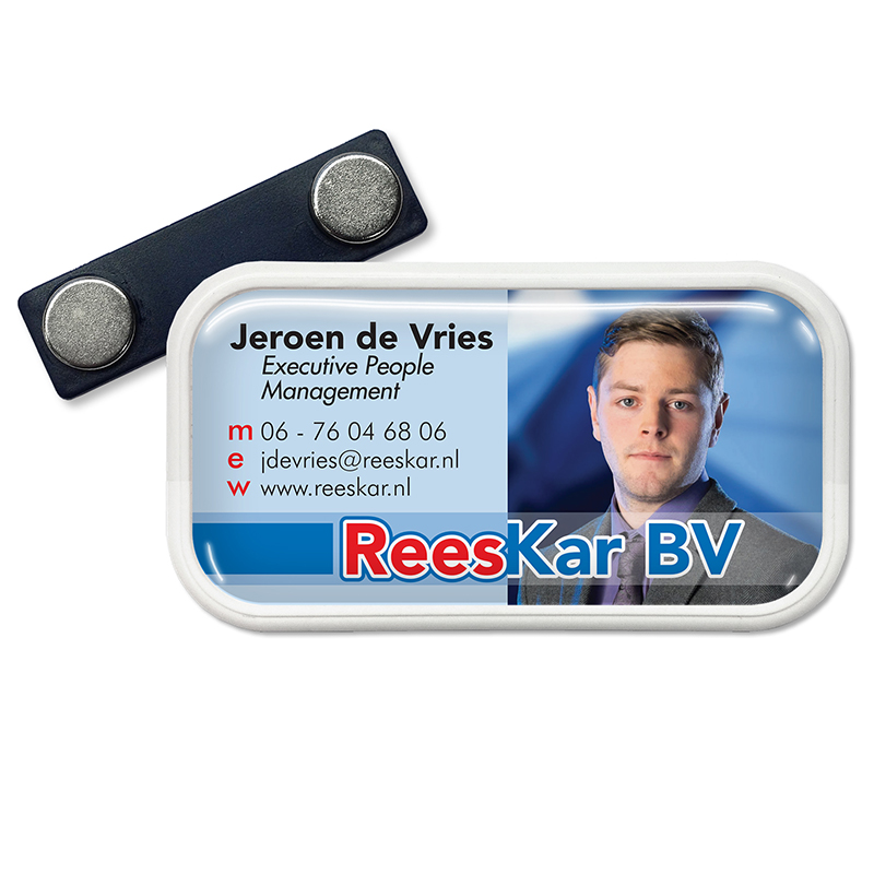 Plastic naambadge inclusief een dominglabel met formaat 70x35 mm. Van de badge blijft een subtiele witte rand rondom zichtbaar. Maak het dominglabel binnen het aangegeven formaat vrij op naar eigen wens in bijvoorbeeld je eigen huisstijl of die van de klant. Door de dominghars krijgt het label een blinkende uitstraling. De badge wordt bevestigingd met een magneetsluiting.