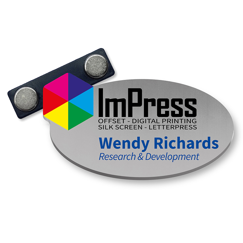 Custommade Naambadge gemaakt van oerdegelijk 1 mm dik alumunium. De opdruk wordt in full colour rechtstreeks op het materiaal geprint met hoogwaardige UV-inkten. Het resultaat is een keiharde bedrukking en super slijtvaste naambadge. De vorm van het aluminium is bijna onbeperkt te maken. Geef je wensen door, dan maken we samen met de technische productie een uniek product. Bevestiging aan je kleding kan met een magneet- of speldsluiting. Vraag naar onze scherpe prijzen en mogelijkheden.