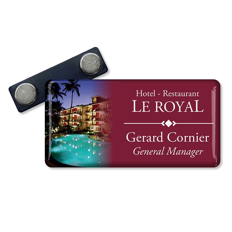 Plastic rechthoekige naambadge 80 x 40 mm met chique dominglabel geleverd. Het kunststoffen plaatje wordt netjes afgewerkt door beplakken met de hoogwaardige doming. Het dominglabel is geprint op kwaliteits vinyl met hoge resolutie printers en briljante inkten. De bevestiging aan de kleding gaat met een magneetsluiting, dus het laat geen beschadigingen of gaatjes achter.