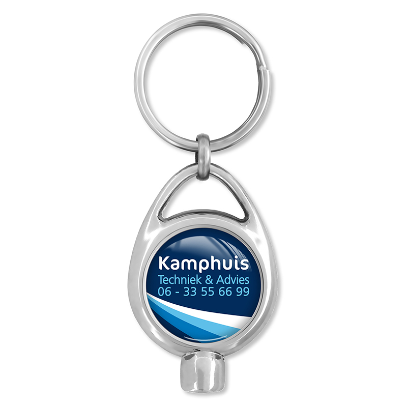 Zilveren sleutelhanger met flessenopener eraan. Op het vlakke stuk op de hanger kan een dominglabell bevestigd worden met een formaat van 42,3 x 9,3 mm. Een populair relatiegeschenk omdat het vaak onder de aandacht komt bij mensen!