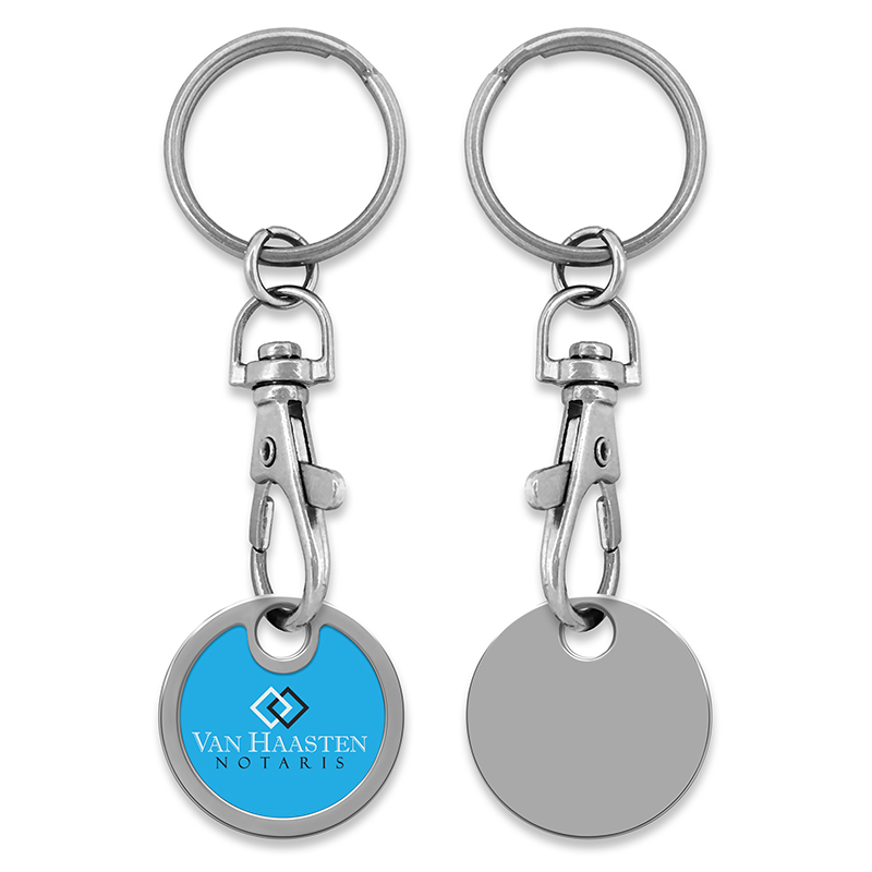 Wil je een praktische, subtiele en opvallende sleutelhanger? Kies dan voor deze metalen sleutelhanger met daaraan een winkelwagenmunt. Het muntje wordt eenzijdig beplakt met een hoogwaardige full colour sticker met laminaat. Deze heeft het formaat van 19 x 19 mm. Zo heb je snel een handige reclamedrager die men vaak gebruikt.