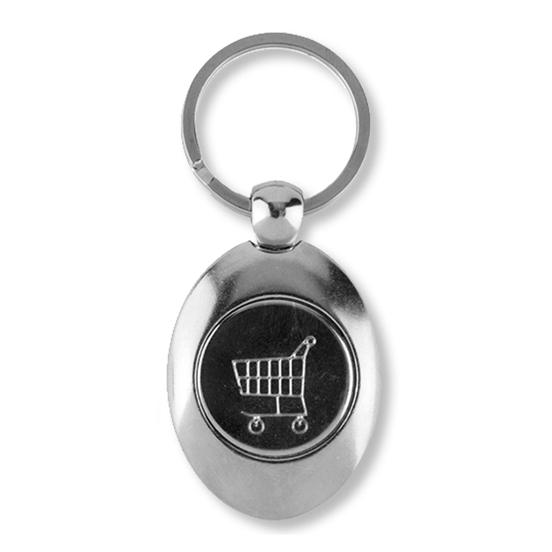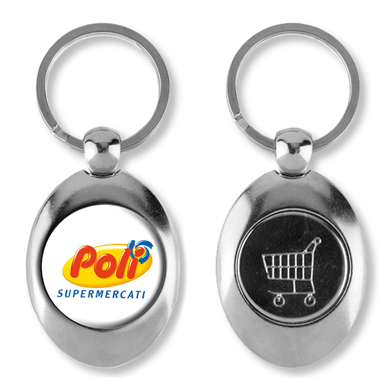 Ovale robuuste metalen sleutelhanger met een winkelwagenmunt aan de achterkant er in verwerkt. Deze munt blijft stevig op z'n plek door een magneet die in de sleutelhanger gemonteerd is. Aan de voorzijde van de sleutelhanger is een fraaie dominglabel geplaatst van Ø 25 mm. Een stevige en elegante hanger dus en daarmee een mooi promotieartikel.