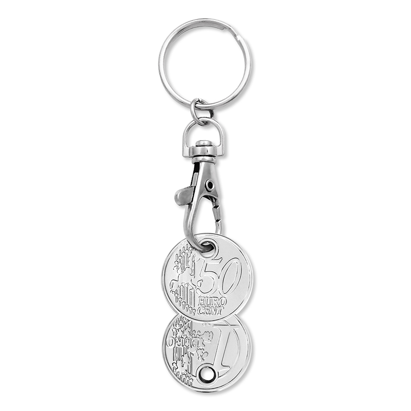 Metalen sleutelhanger met aan beide zijden een vorm van winkelwagenmunt van € 1,- en van € 0,50. Enkelzijdig wordt een gelamineerde full colour sticker gemonteerd, waarmee de hanger een uitstekend promo-artikel is, want het valt op en is functioneel. Het formaat van de sticker is 26,5 x 20,4 mm.