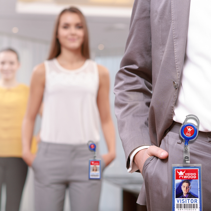Transparante Badgehouder met dominglabel van Ø 20 mm. De houder is verkrijgbaar in rood en blauw en heeft een clipsluiting voor bevestiging aan de broekriem.