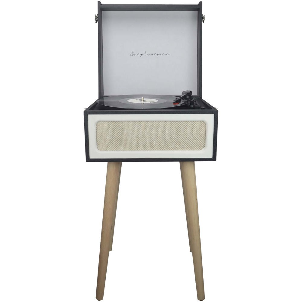 Draaitafel voor platen met 2 speakers van elk 5 W. Het heeft een geïntegreerde FM-radio en een draadloze Bluetooth® 5.0-verbinding om apparaten te koppelen en muziek af te spelen, 2 RCA-audio- en hoofdtelefoonuitgangen. De draaitafel heeft een robijnen naald en een stofkap. Vintage design met houten poten.