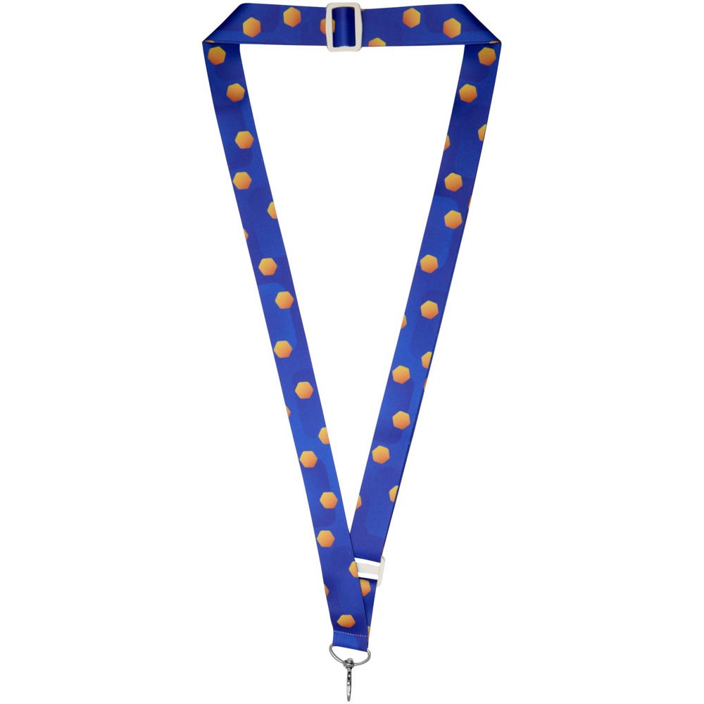 De verstelbare lanyard is voorzien van een schuifgesp waarmee de lengte eenvoudig kan worden aangepast, en een stevige metalen haak om een naamkaartje, ID-kaart of sleutels veilig vast te houden. De lanyard kan enkel- of dubbelzijdig bedrukt worden, met keuze uit standaard of “fitted” dubbelzijdige bedrukking (bij fitted lopen de ontwerpen aan beide zijden precies op elkaar). Gemaakt in Europa.