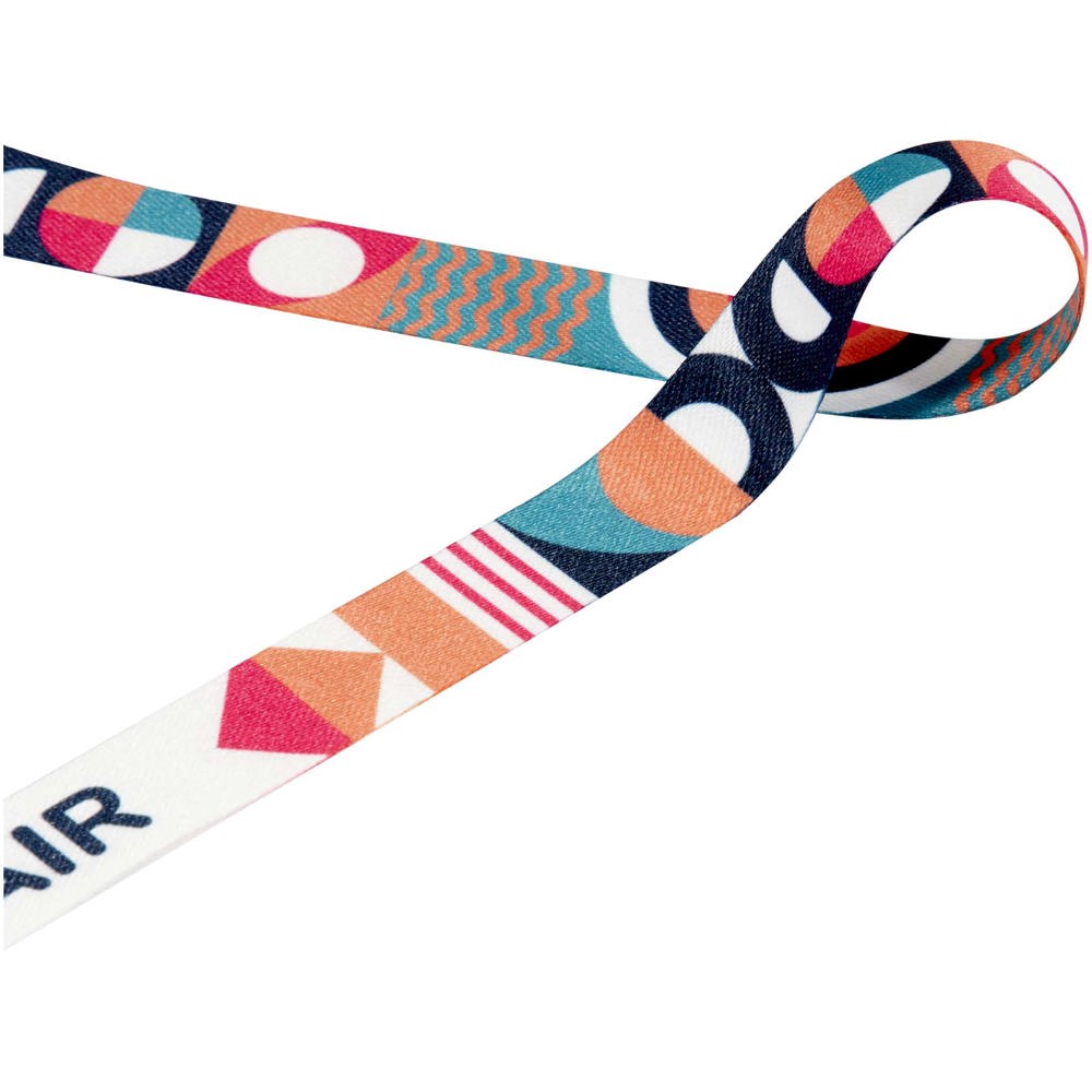 Sublimatielanyard van RPET met full colour ontwerp, RPET-tape en 2 metalen haken. Kan een naambadge, ID-kaart of sleutels bevatten. Verkrijgbaar in 4 verschillende breedtes: 10, 15, 20 en 25 mm.