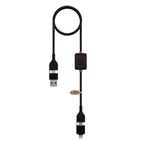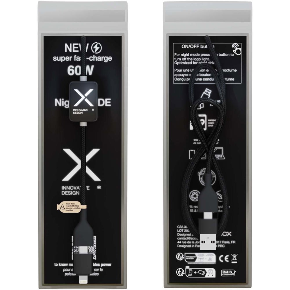 Deze 1-meter, 60W supersnelle oplaadkabel heeft een verlicht logo met een schakelknop om het licht uit te schakelen voor comfortabel gebruik s nachts, ideaal voor slaapkamers of autos. Ontworpen voor gegevensoverdracht met Apple CarPlay en Android Auto, biedt hij Type-C- en Lightning-uitgangen, samen met dubbele USB-A- en USB-C-ingangen voor universele compatibiliteit, inclusief de nieuwste MacBook-modellen. De kabel is gemaakt van gerecycled ABS/PET-plastic en aluminium, en bevat soft-touch rubber aan n uiteinde en satijn-afgewerkt gerecycled plastic aan het andere uiteinde. Wordt geleverd in een recyclebare TPU-zak met een gerecycled kartonnen achterzijde.