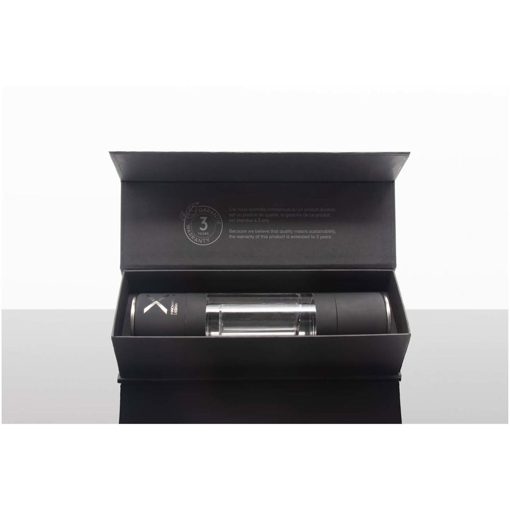 Verhoog je kruidenervaring met deze dubbele keramische molen, die innovatieve functionaliteit combineert met elegant design. Om te vullen, draai eenvoudig de bovenkant los om toegang te krijgen tot elk compartiment, voeg grof zout of hele peperkorrels toe en sluit het deksel. Een discreet knopje aan de basis stelt je in staat de maling naar wens aan te passen. Kan worden aangepast met lasergravure met een metallic-effect. Wordt geleverd in een gerecycleerde kartonnen geschenkverpakking. Zout en peper niet inbegrepen.