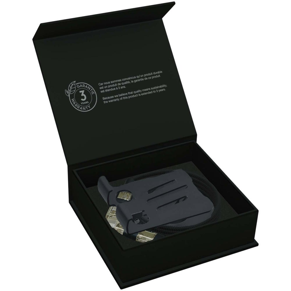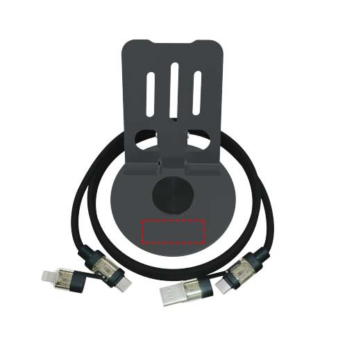 Opvouwbare 360° telefoonstandaard in gunmetal-kleur met lichtgevende uiteinden, geleverd met een 4-in-1 rPET-kabel met dubbele input (USB-C/USB-A) en dubbele output (USB-C/Lightning). Dit product is primair ontworpen voor telefoons, maar dankzij de meegeleverde 240W-kabel kunnen ook krachtige apparaten zoals laptops, gameconsoles, powerstations en drones worden opgeladen. Het logo is met laser gegraveerd op de standaard. Geleverd in een gerecyclede kartonnen geschenkverpakking.