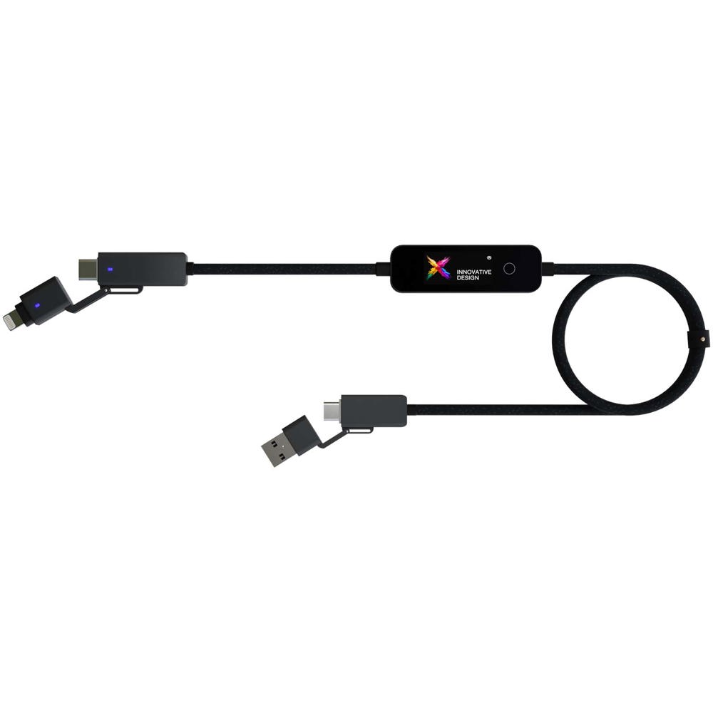Ultrasnelle 100W oplaadkabel met digitaal kleurendisplay dat realtime het laadvermogen toont en een volledig personaliseerbaar schermlogo met ondersteuning voor geanimeerde GIF’s. Geschikt voor smartphones, tablets en laptops en ondersteunt Apple en Android CarPlay. Voorzien van een lengte van 1 meter, USB-C- en iPhone-connectoren, gerecyclede siliconen kabels, zinklegering eindstukken en dubbele USB-A + USB-C input. Geleverd in een recyclebare TPU-hoes met gerecyclede papieren inleg.