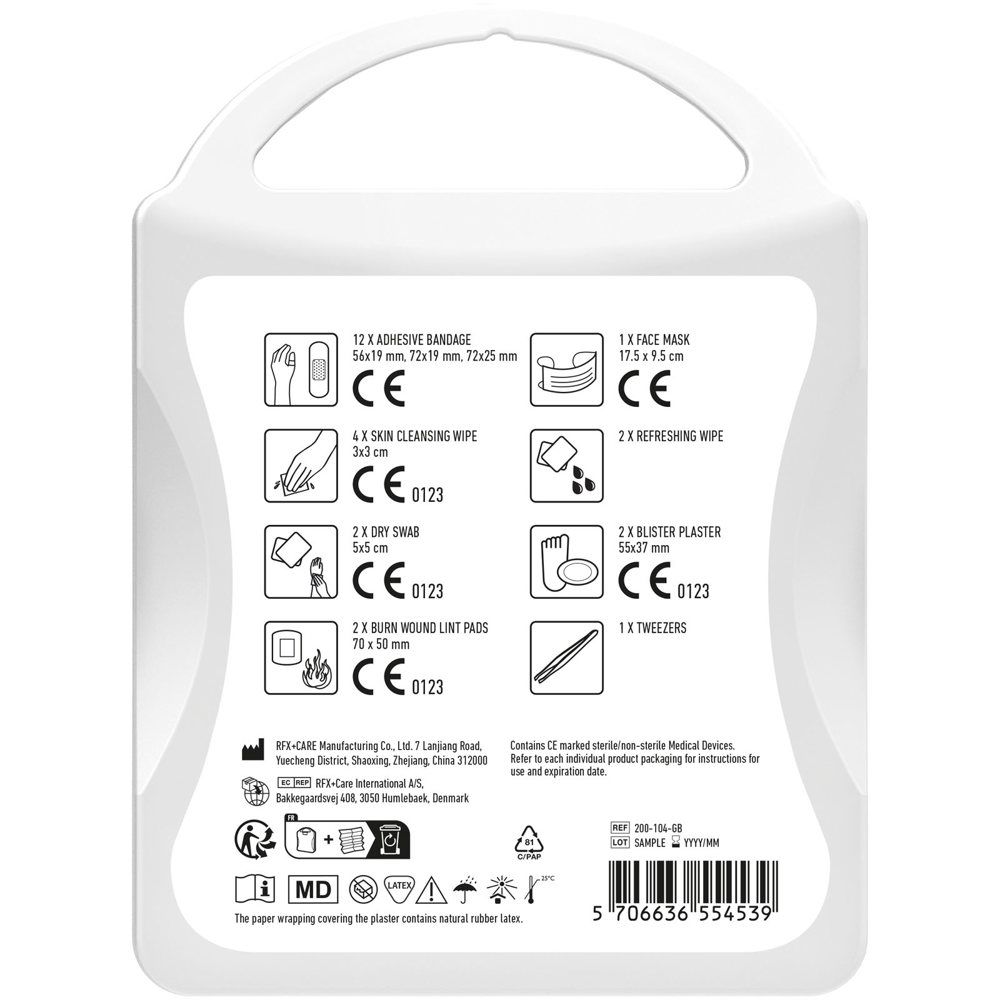 Een ideale eerstehulpset voor op je werkplek. Deze set moet op elke werkplek aanwezig zijn om voorbereid te zijn op kleine verwondingen en noodgevallen. Inhoud: 12 waterbestendige pleisters, 4 huidreinigingsdoekjes, 2 droge doekjes, 1 masker, 2 blarenpleisters, 2 brandwondpluisjes, 2 verfrissende doekjes, 1 pincet. Alle eerstehulp- en verzorgingsproducten in de set voldoen aan alle geldende EU-voorschriften. Prijs is inclusief full colour bedrukking.