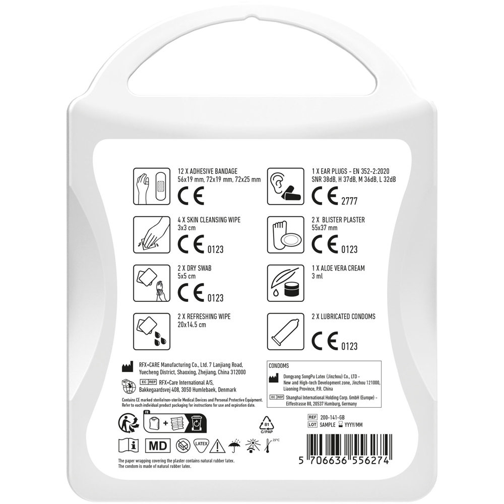 De perfecte EHBO-kit voor elk festival of feest. Deze kit bereidt je voor op elke situatie op elk feest of festival. Inhoud: 12 Waterbestendige pleisters, 4 Vochtige reinigingsdoekjes, 2 Droge reinigingsdoekjes, 2 Verfrissingsdoekjes, 2 Condooms, 2 Blarenpleister, 1 Aloe vera crème, 1 paar Oordopjes. Alle eerstehulp- en verzorgingsproducten in de set voldoen aan alle geldende EU-voorschriften. Prijs is inclusief full colour bedrukking.