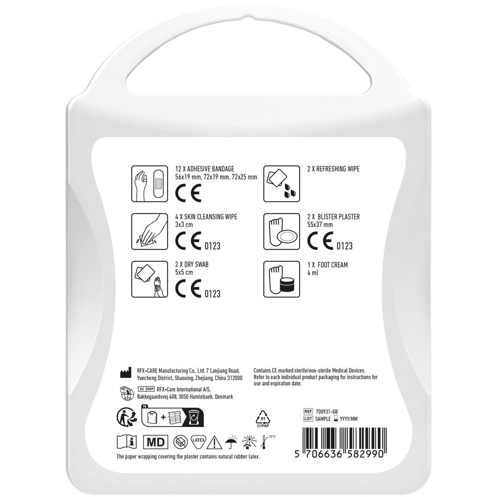 De actieve levensstijl MyKit dekt de behoeften aan basiswondverzorging, blaren en een herstellende voetgel. Ideaal om mee te nemen bij activiteiten zoals wandelen, trektochten, hardlopen, golfen enz. Alle EHBO- en verzorgingsproducten in de kit voldoen aan alle toepasselijke EU-regelgeving. Prijs is inclusief full colour print.