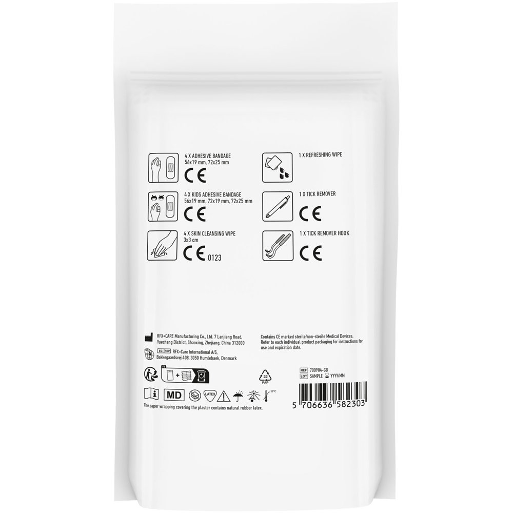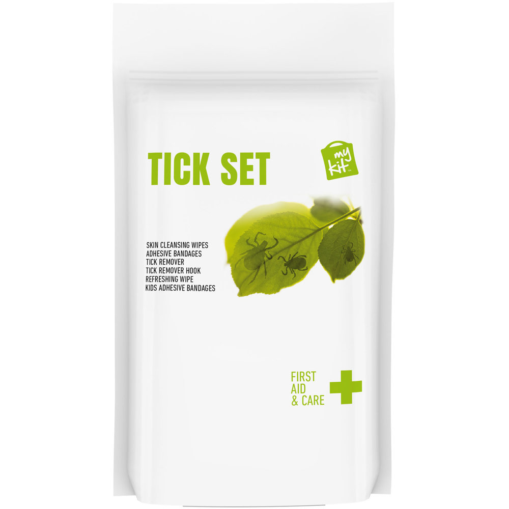 De perfecte kit voor het verwijderen van teken en het behandelen van hun beten bij mens en dier. Inhoud: 4 waterbestendige pleisters, 4 huidreinigingsdoekjes, 1 tekenverwijderaar blauw (mens), 1 tekenverwijderaar haak (oranje), 4 kinderpleisters, 1 verfrissend doekje. Alle eerstehulp- en verzorgingsproducten in de set voldoen aan alle geldende EU-voorschriften. Prijs is inclusief full colour bedrukking. Geleverd in een papieren stazak.