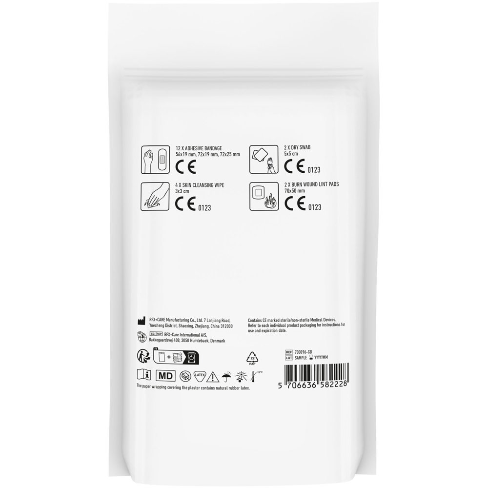 Een handige MyKit welke geschikt is voor reisbureaus, vakantie aanbiedingen, luchtvaartmaatschappijen en busreizen aanbieders - of zelfs voor werknemers om bij een zakenreis het merk mee te nemen om altijd voorbereid op reis te gaan. Inhoud:12 Waterbestendige pleisters, 4 Vochtige reinigingsdoekjes, 2 Droge reinigingsdoekjes, 2 Brandwondencompres. Alle eerste hulp en verzorgingsartikelen in de kit voldoen aan de EU regelgeving. Prijs is inclusief full colour bedrukking. Geleverd in een papieren stazak.
