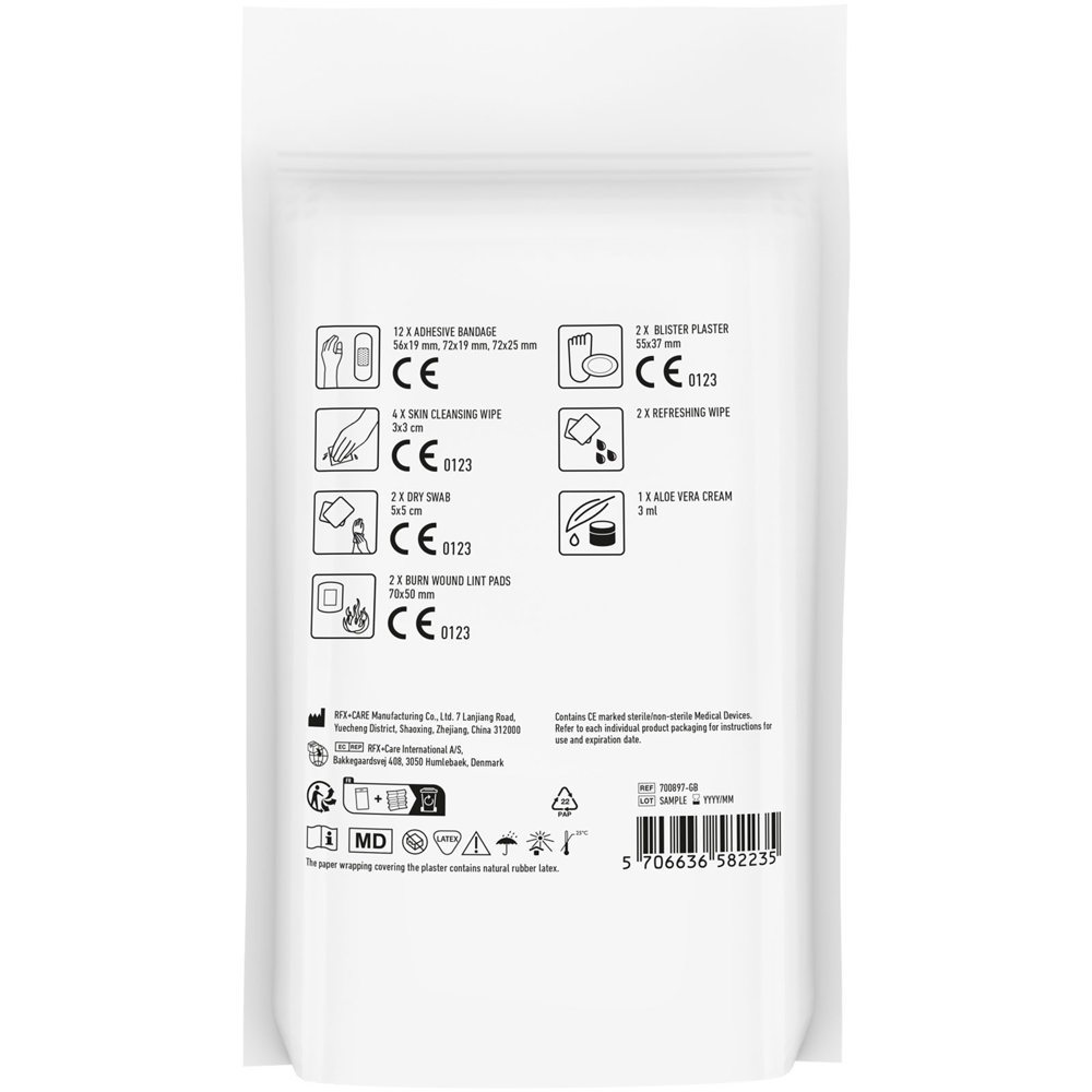 Een handige uitgebreide MyKit welke geschikt is voor reisbureaus, vakantie aanbiedingen, luchtvaartmaatschappijen en busreizen aanbieders - of zelfs voor werknemers om bij een zakenreis het merk mee te nemen om altijd voorbereid op reis te gaan. Inhoud:12 Waterbestendige pleisters, 4 Vochtige reinigingsdoekjes, 2 Droge reinigingsdoekjes, 2 Brandwondencompres, 1 Blarenpleister, 2 Verfrissingsdoekjes, 1 Aloe vera crème. Alle eerste hulp en verzorgingsartikelen in de kit voldoen aan de EU regelgeving. Prijs is inclusief full colour bedrukking. Geleverd in een papieren stazak.