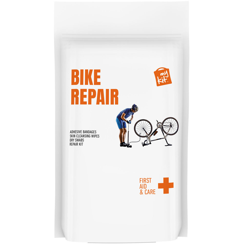 Deze Mykit is speciaal samengesteld voor fietsers. Of u nu de bergen in gaat of met het hele gezin op pad bent op vakantie. Met deze kit bent u voorbereid op eventuele kleine ongevallen tijdens het fietsen of een lekke band. Inhoud:12 Waterbestendige pleisters, 4 Vochtige reinigingsdoekjes, 2 Droge reinigingsdoekjes, 1 Fiets Repartiesetje. Alle eerste hulp en verzorgingsartikelen in de kit voldoen aan de EU regelgeving. Prijs is inclusief full colour bedrukking. Geleverd in een papieren stazak.