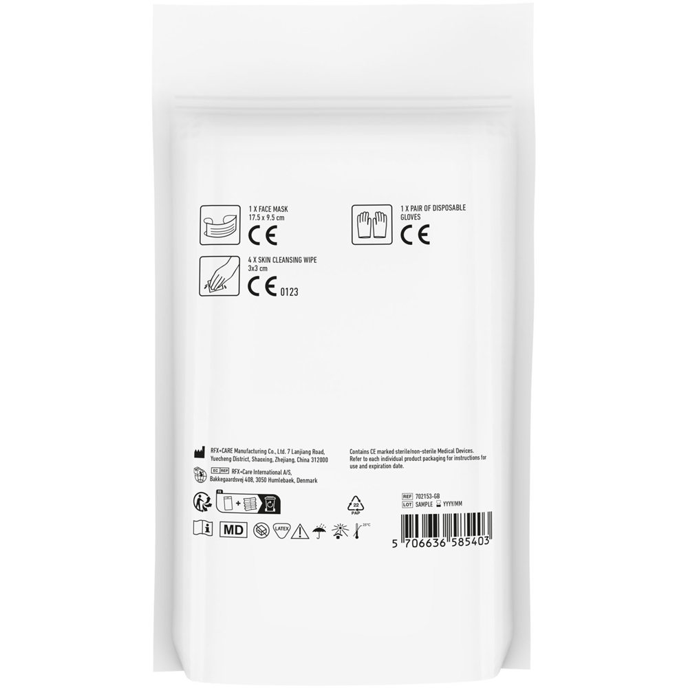 Beschermingskit handig om thuis te bewaren, in de auto, of om mee te nemen op vakantie. Inhoud van de kit: 1 mondmasker, 4 handreinigende doekjes en 1 paar handschoenen. Alle eerste hulp en verzorgingsartikelen in de kit voldoen aan de EU regelgeving. Prijs is inclusief full colour bedrukking. Geleverd in een papieren stazak.