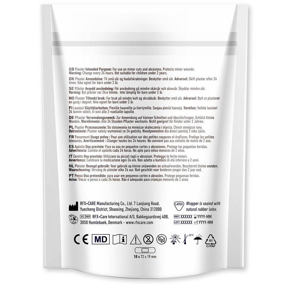 10 stuks personaliseerbare pleisters, geleverd in een papieren zakje (150 x 95 mm). Digitale full colour print beschikbaar op de verpakking. Dit product voldoet aan de strenge eisen van de Verordening Medische Hulpmiddelen (MDR) en is in meerdere landen geregistreerd bij de FDA. Voldoet aan de normen ISO14001:2015 en ISO9001:2015. Grootte van de pleister: 72 x 19 cm.