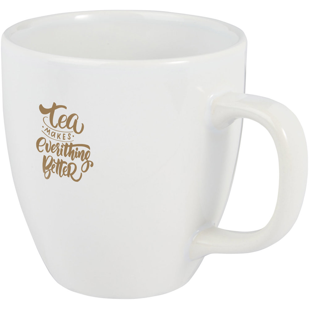 De keramische mok van Moni heeft een trendy glanzende afwerking die een strakke touch toevoegt. Hij heeft een groot handvat dat zorgt voor een comfortabele en stevige greep. De mok is veelzijdig genoeg om te gebruiken met zowel warme als koude dranken, zodat u kunt genieten van koffie, thee, soep en meer. Inhoud 430 ml Vaatwasmachinebestendig voor alle afdrukmethoden. Geleverd in een gerecycled kartonnen geschenkverpakking.