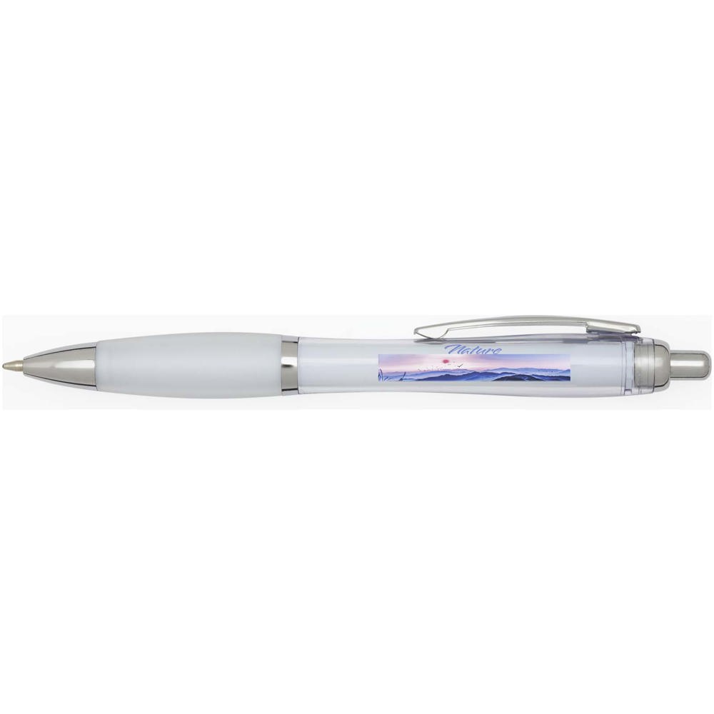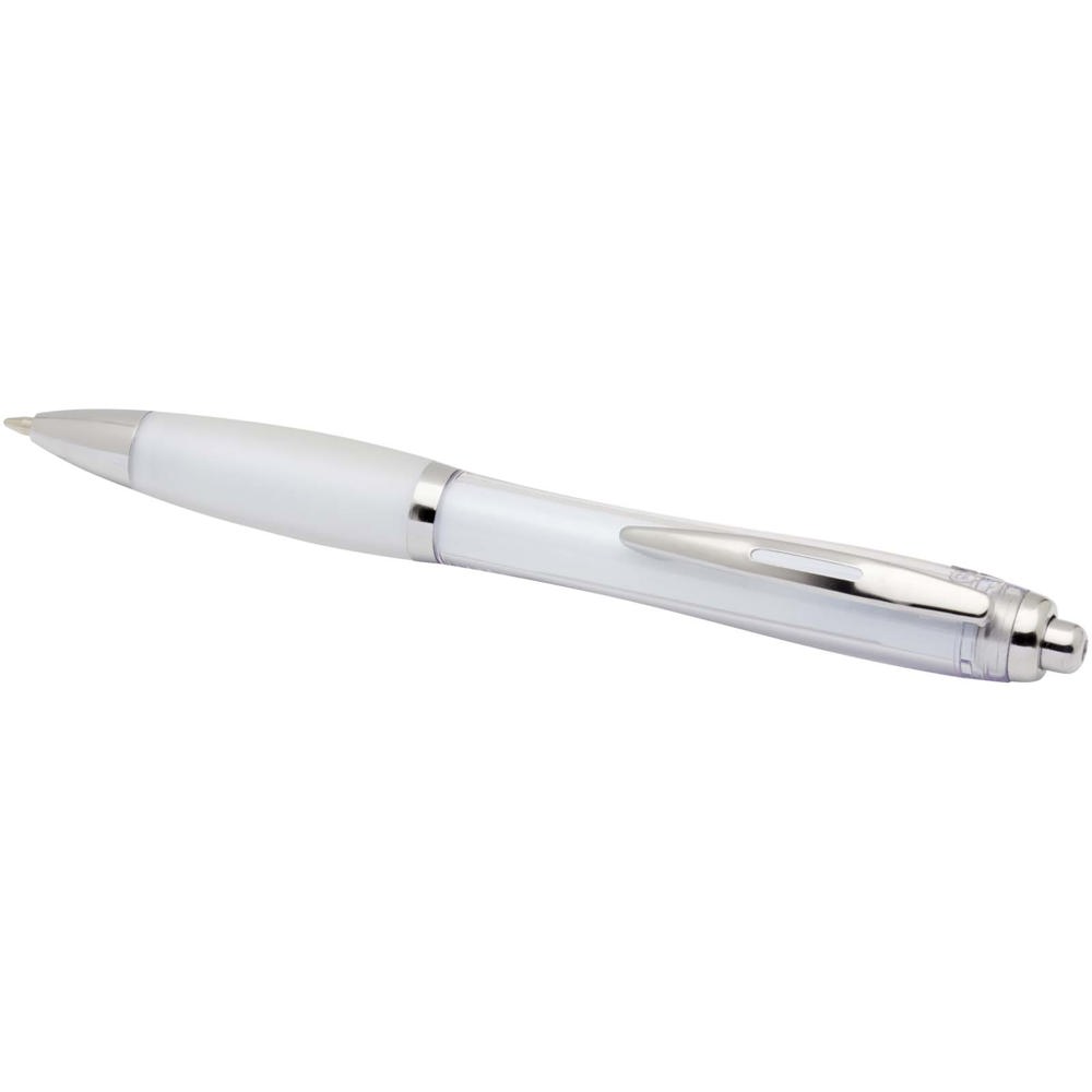 De Nash balpen van gerecycled plastic heeft een stijlvol, gebogen ontwerp met een transparante, gekleurde behuizing met zilveren accenten en een bijpassende zachte grip voor comfortabel schrijven. Het is gemaakt van RCS-gecertificeerd gerecycled ABS plastic, waardoor het gebruik van nieuwe grondstoffen wordt verminderd zonder dat dit ten koste gaat van de duurzaamheid. Op de achterkant staat een rABS-logo, dat aangeeft dat het product gerecycled materiaal bevat. Inktkleur: zwart. Stiftmaat: 1,0 mm. Schrijflengte: 1000 meter.