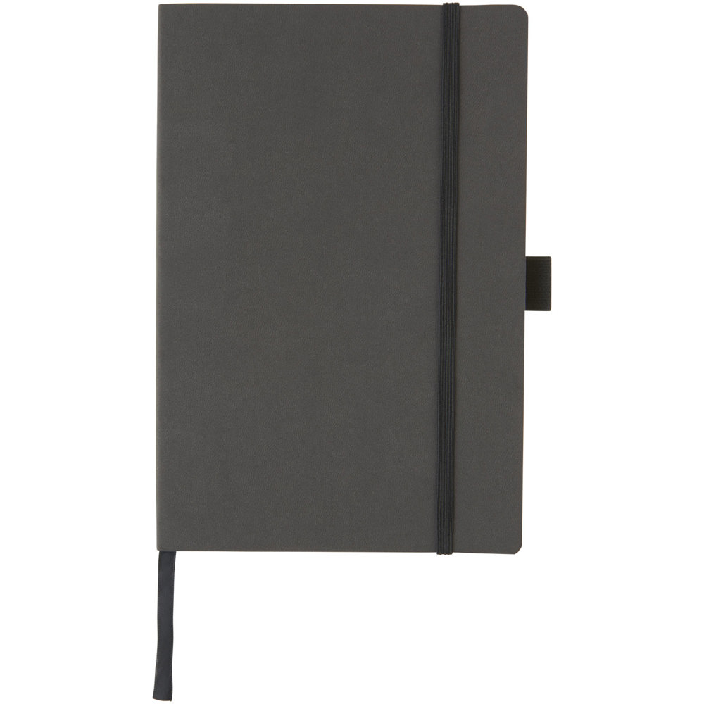 Flexibel notitieboekje (A5 formaat) met zacht aanvoelende kaft, geïntegreerde elastische sluiting, lint als bladwijzer, penlus, documentvak aan de binnenkant van de achteromslag en 80 vellen (80 g/m2) crèmekleurig gelinieerd papier. Verpakt in een zwarte hoes.