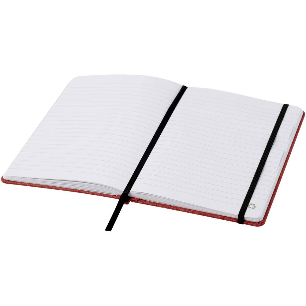 Notitieboek in A5 formaat met cover gemaakt van RPET-stof. Bevat 96 vellen 70 g/m² gerecycled papier met gelijnde lay-out, een penlus en lint. Verpakt in een kartonnen hoes.