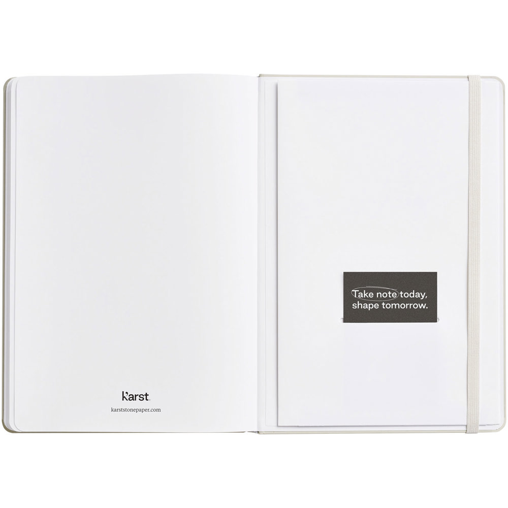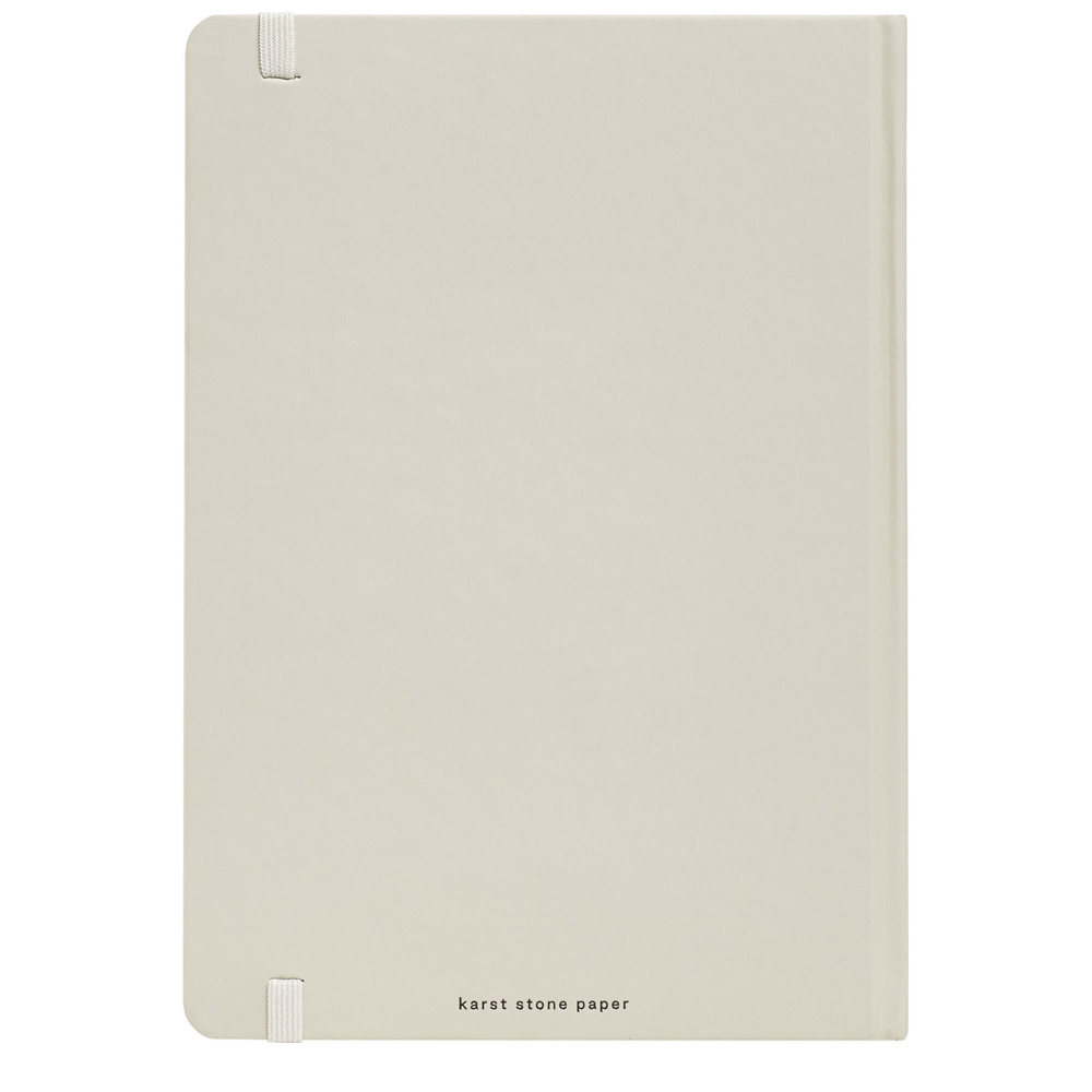 Het Karst® A5 notitieboek met hardcover is een bestseller en een publiekstrekker. De gladde textuur van de pagina's en de platte binding bieden voldoende comfort en schrijfruimte voor uw notities en ideeën. Voorzien van een elastische band om het notitieboek dicht te houden, 144 waterbestendige, scheurvaste gelinieerde pagina's, een uitvouwbaar achtervak voor opbergruimte en een scheidingslint met hitteverzegelde punt en afgeronde hoeken.