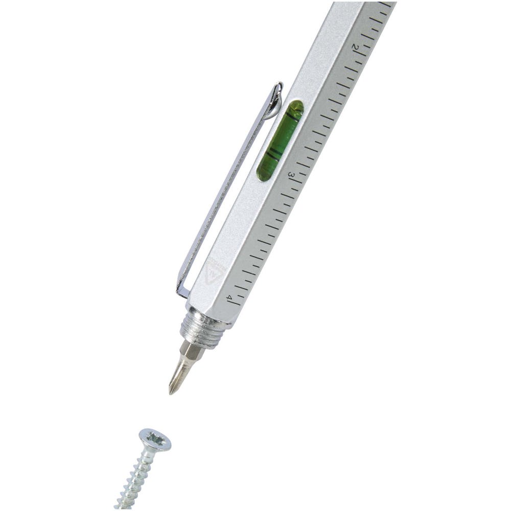 De Dora aluminium multifunctionele balpen is gedeeltelijk gemaakt van gerecycled materiaal en heeft een dubbelzijdige liniaal, hendel, schroevendraaier, gradenboog en een zwarte rubberen stylus. De houder is gemaakt van gerecycled aluminium met een zilveren spraycoating. De clip is gemaakt van ijzer. De schroevendraaier is gemaakt van staal. Het bovenste gedeelte en de punt zijn gemaakt van RABS. Inktkleur: zwart. Schrijflengte: 400 meter. Stiftmaat: 1,0 mm.