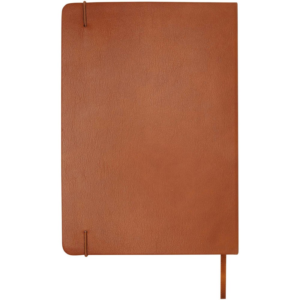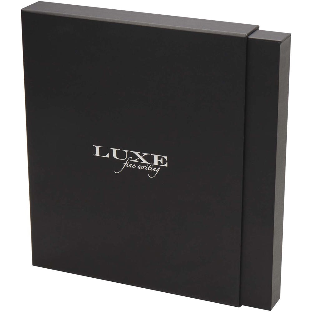 De Legato is een elegante combinatie van een A5 notitieboek en een rollerbalpen. De pen heeft een bovenste houder van gerecycled messing met goudverchroomde afwerking, een onderste houder met een zwart/bruine spraycoating, metalen goudverchroomde accessoires en een luxe logo op de middelste ring. Inktkleur: Blauw. Schrijflengte: 400 meter. Stiftmaat: 0,7 mm. Het notitieboek heeft 80 vellen gelinieerd papier van 80 g/m², een kaft van gerecycled plastic, een elastische sluiting, een lintmarkering en een accordeonvak. Goudverchroomd metalen accessoire op de elastische sluiting. Gepresenteerd in een gerecyclede kartonnen geschenkverpakking.