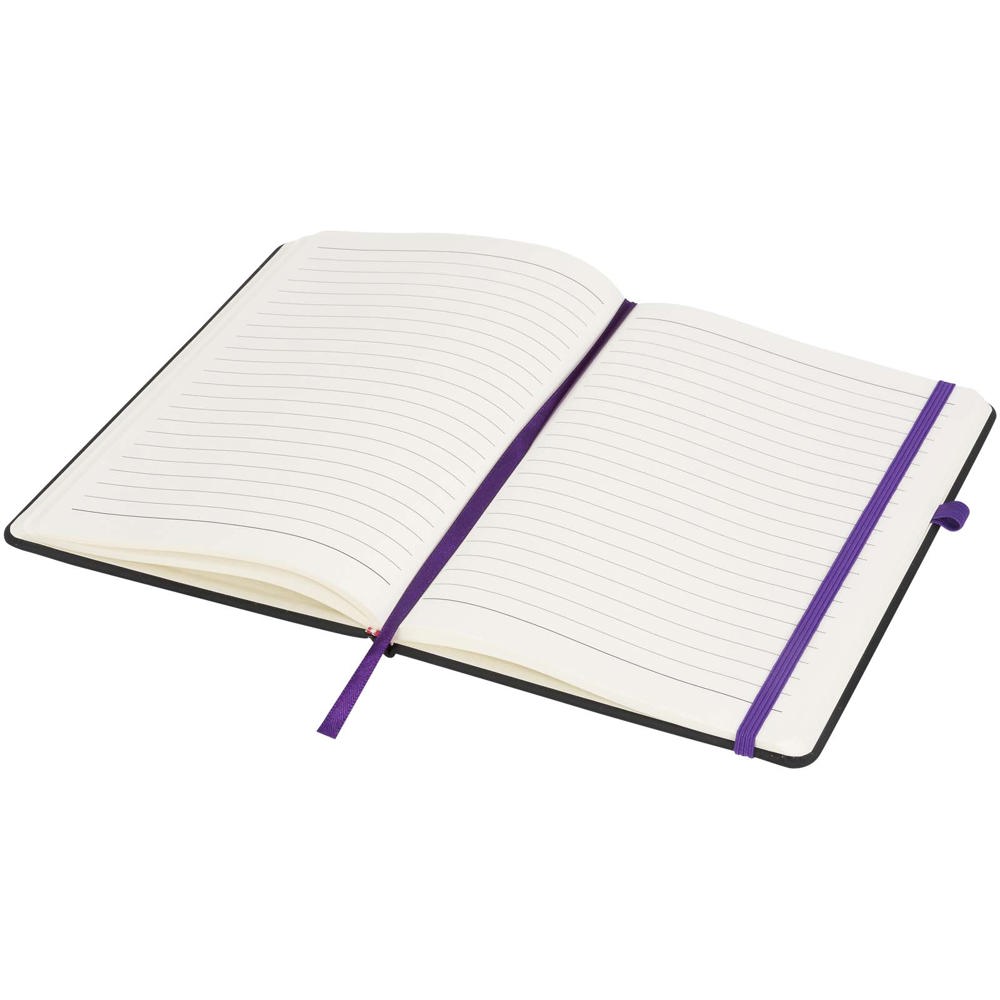 Het Noir-notitieboek heeft een harde PU omslag wat zacht aanvoelt voor een tastbare afwerking. Elk notitieboek heeft een gekleurd sluitbandje, penlus en bladwijzer. Het notitieboek bevat 96 bladen (70g/m2) crèmekleurig lijntjespapier.