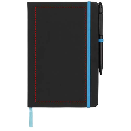 Modern en stijlvol A5-formaat zwart notitieboek met harde kaft en zacht aanvoelend materiaal. Beschikt over gekleurde paginaranden en een bijpassende pagina-lint in kleur, elastische sluiting en penlus voor een coherente look. De kleurdetails in combinatie met een digitale kleurenprint bieden een perfecte optie om de branding van de klant op de notitieboek extra te benadrukken. Daarnaast biedt de Noir-rand, vanwege de structuur van het materiaal, ook de optie voor een mooie debossing als decoratie. Inclusief 96 pagina’s (70 g / m2) crèmekleurig papier en wordt geleverd met een gratis stylus balpen. De Noir-rand is ook verkrijgbaar in een A6-formaat.