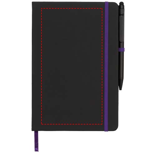 Modern en stijlvol A5-formaat zwart notitieboek met harde kaft en zacht aanvoelend materiaal. Beschikt over gekleurde paginaranden en een bijpassende pagina-lint in kleur, elastische sluiting en penlus voor een coherente look. De kleurdetails in combinatie met een digitale kleurenprint bieden een perfecte optie om de branding van de klant op de notitieboek extra te benadrukken. Daarnaast biedt de Noir-rand, vanwege de structuur van het materiaal, ook de optie voor een mooie debossing als decoratie. Inclusief 96 pagina’s (70 g / m2) crèmekleurig papier en wordt geleverd met een gratis stylus balpen. De Noir-rand is ook verkrijgbaar in een A6-formaat.