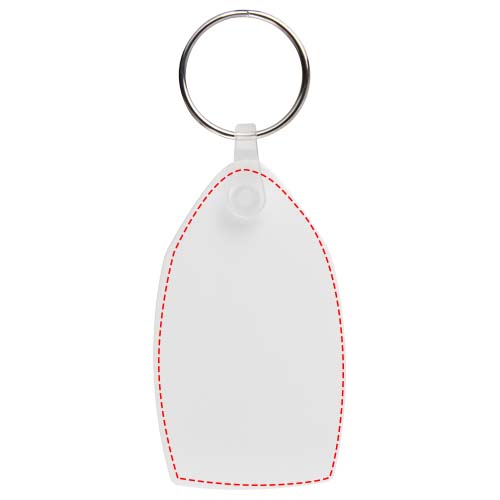 Witte rechthoekige sleutelhanger met metalen gesplitste sleutelring. De metalen lusring biedt een vlak profiel dat ideaal is voor de post.