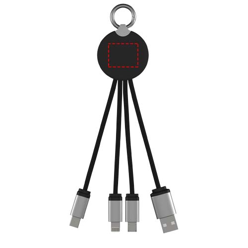 Oplaadkabel met oplichtend logo en rubberen en metalen afwerking, uitgerust met drie aansluitingen (Type C, Android, iPhone). Maximaal drie apparaten kunnen tegelijkertijd worden opgeladen. Lengte van de kabels (inclusief stekkers): 10 cm. RPET kunststof kabel en de verpakking is gemaakt van gerecycled papier en gerecyclede kunststof.