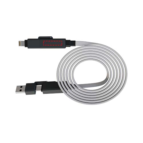 Supersnelle 60 W magnetische oplaadkabel voor smartphones, tablets en laptops. De 1 m platte kabel is voorzien van Type-C- en Lightning-aansluitingen, snoeren gemaakt van gerecyclede plastic flessen en stevige eindstukken van een zinklegering. Dankzij de dubbele USB-A en USB-C-ingang is de kabel 100% compatibel met de nieuwste computermodellen. Volledig compatibel met Apple CarPlay en Android Auto. Maatwerk is mogelijk via lasergraveren op de zinken eindkap. Geleverd met een recyclebaar TPU-etui en een gerecycled papieren inzetstuk.