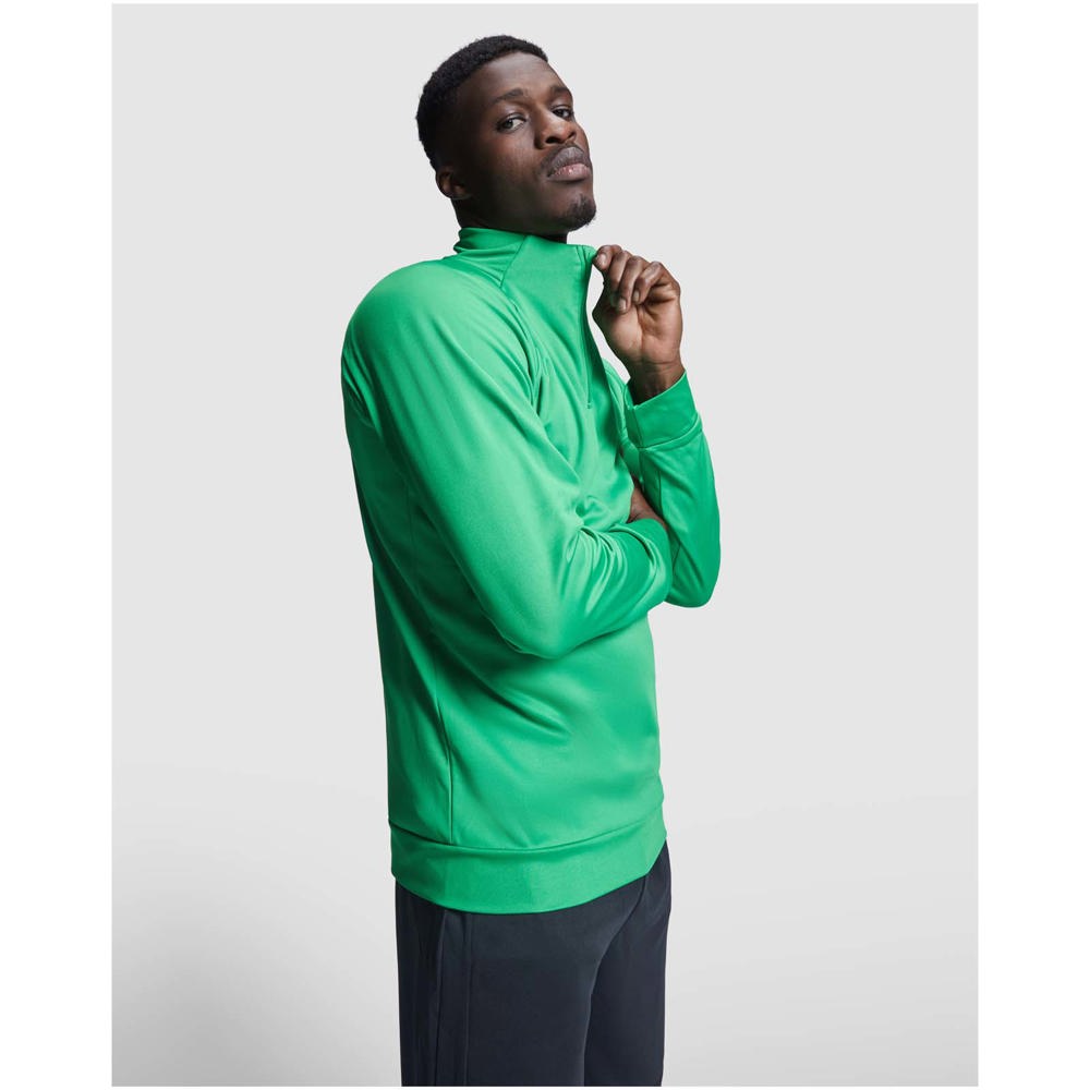 Technische stof. Raglanmouwen. Fleece aan de binnenkant. Kraag met halve rits en bijpassende verstevigde bedekte naden. 1x1 rib in kraag, manchetten en zoom. Verwijderbaar label. Sweatshirt passend bij Neapolis broek.