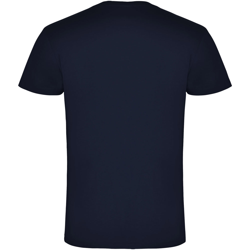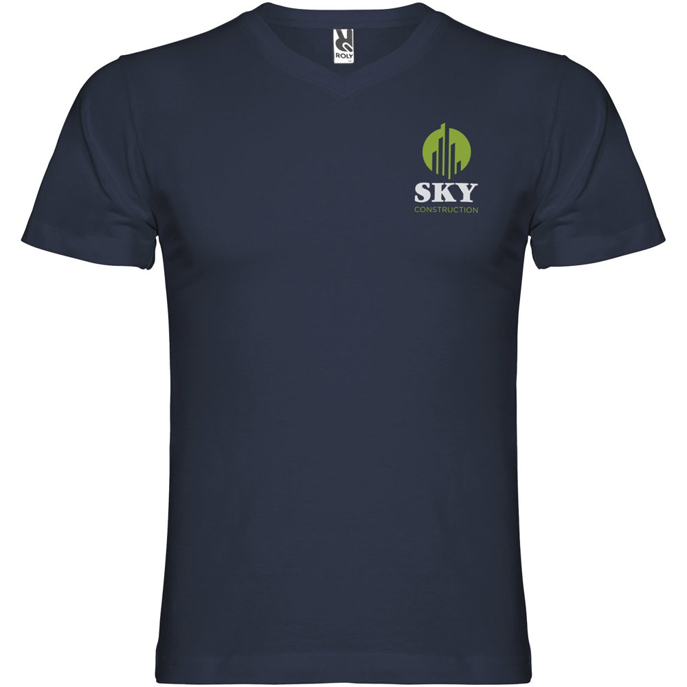 Buisvormig T-shirt met korte mouwen en tweelaags V-hals. Versterkte bedekte naden in kraag en schouders. Verwijderbaar etiket. Het model is 190 cm en draagt maat L.