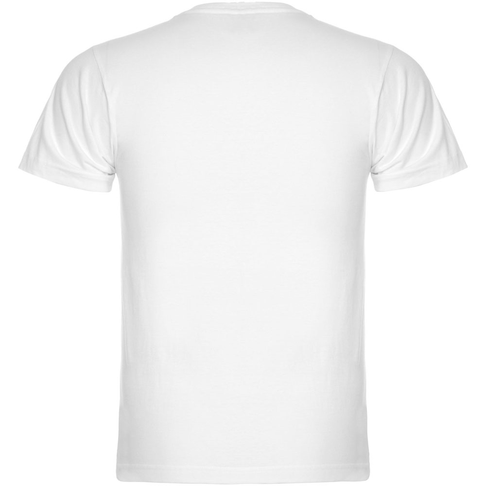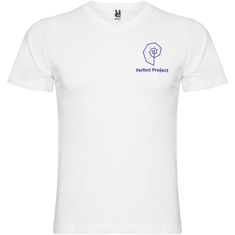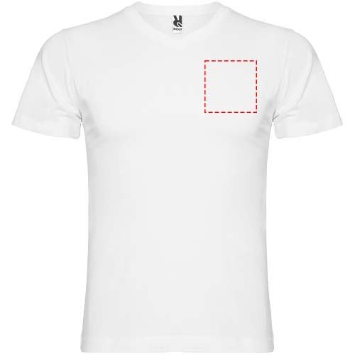 Buisvormig T-shirt met korte mouwen en tweelaags V-hals. Versterkte bedekte naden in kraag en schouders. Verwijderbaar etiket. Het model is 190 cm en draagt maat L.